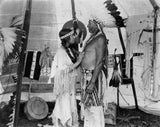 THE DAUGHTER OF DAWN is an 80-minute, feature silent film that was shot in May, June, and July of 1920 in the Wichita Mountains of southwest Oklahoma. The story, played by an all-Native American cast of 300 Kiowas and Comanches, includes a romantic rivalry, buffalo hunts, a battle, village scenes, dances, deceit, courage, hand-to-hand combat, and even a happy ending. The Native American actors, who in 1920 had been living on reservations for less than fifty years, brought with them their own tipis, horses, clothing, and material culture.